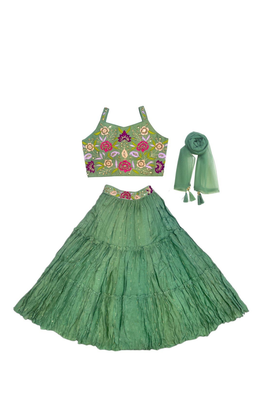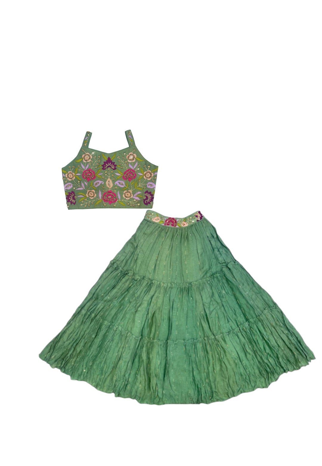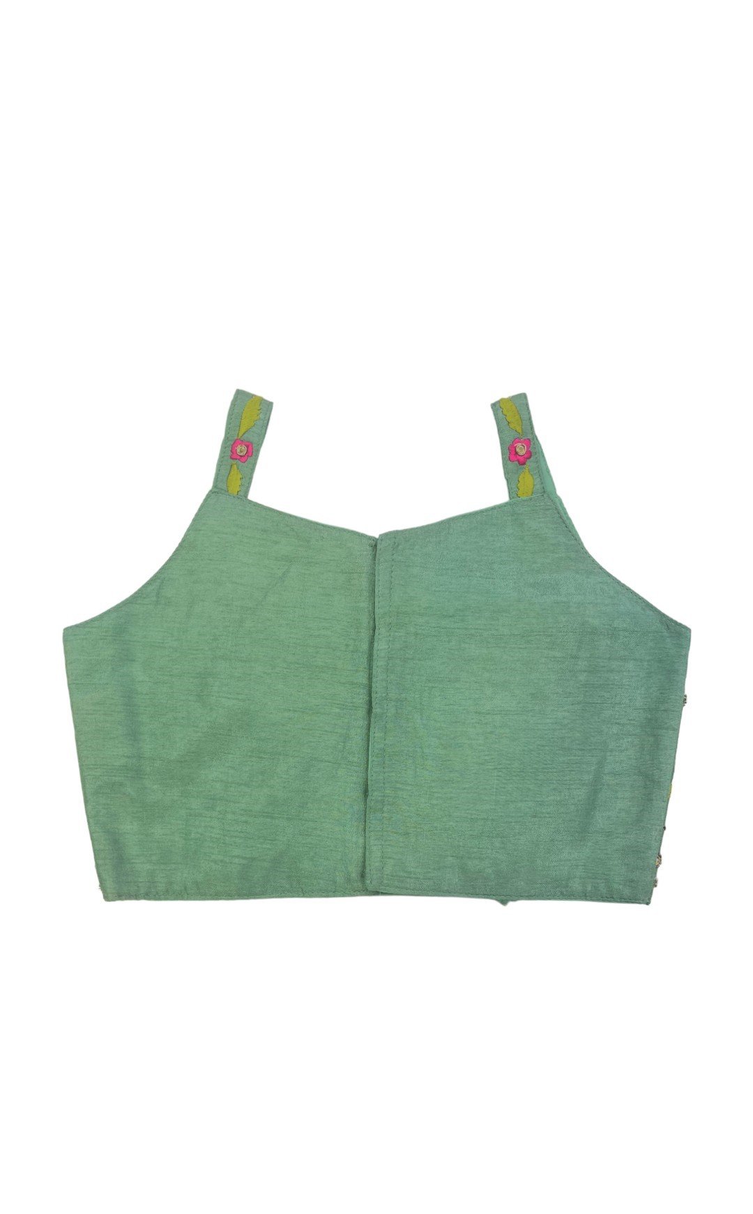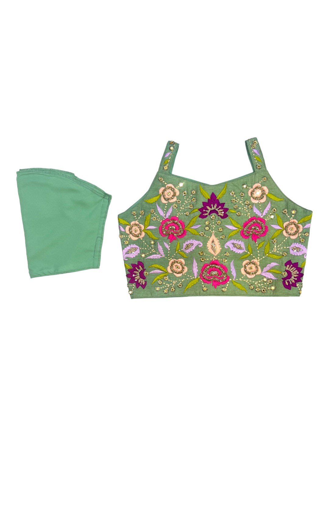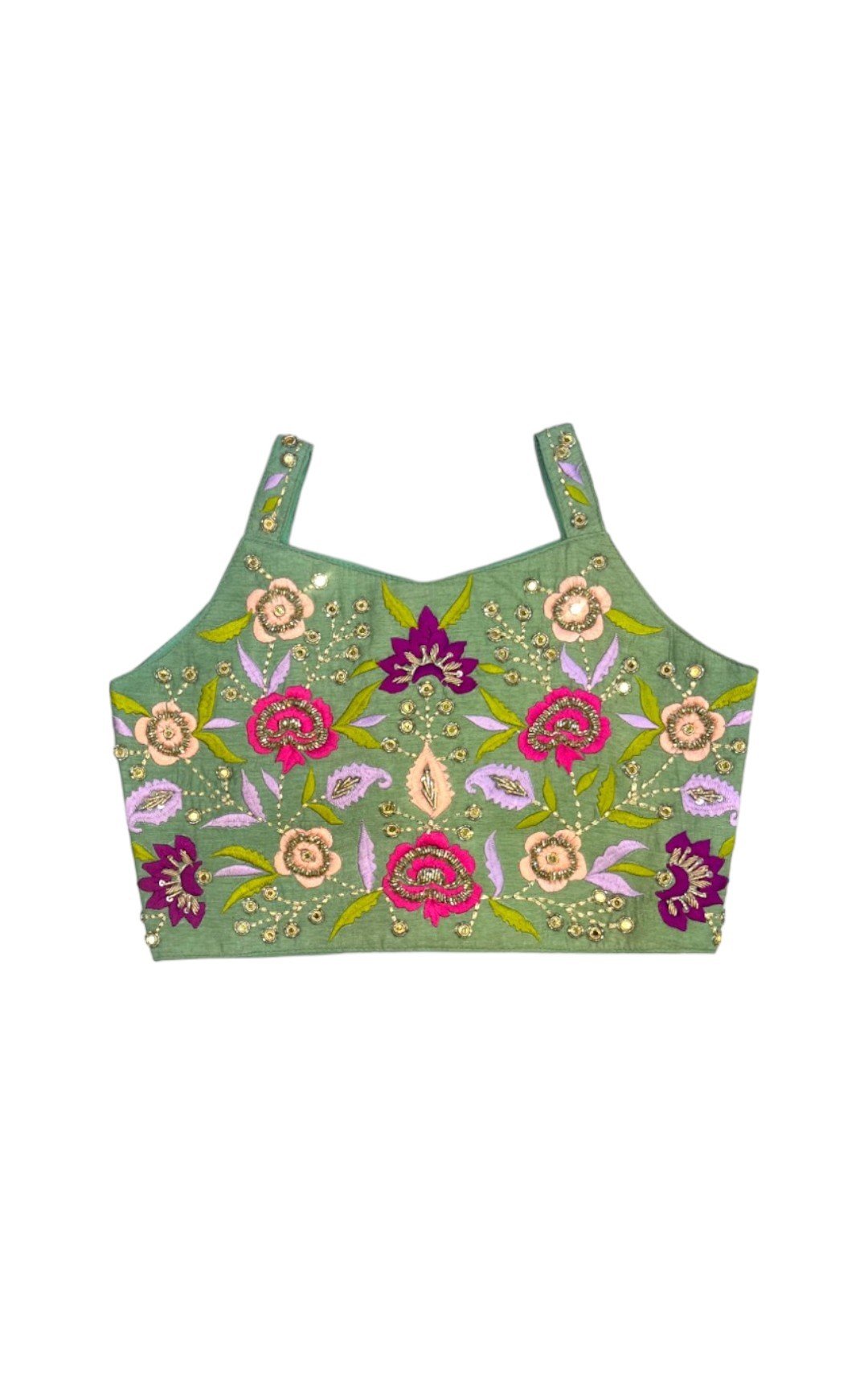 • Spaghetti Top with Floral Thread & Moti work design green choli